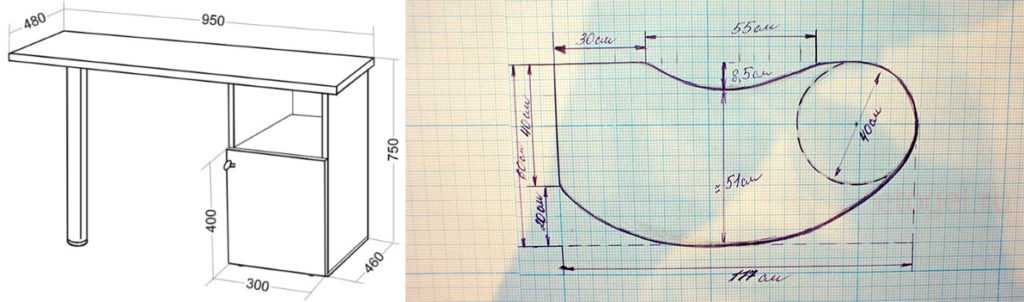 Столы могут иметь стандартную форму, включать в себя небольшую тумбу для хранения принадлежностей. Складная либо откидная столешница дополняется стеллажами, подставками и полками. Грамотно составленные чертежи состоят не только из необходимых размеров, обязательно указывается местоположение отверстий для встроенного оборудования.