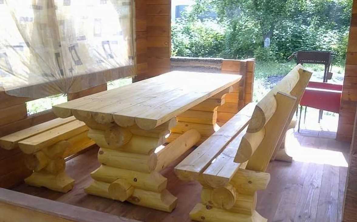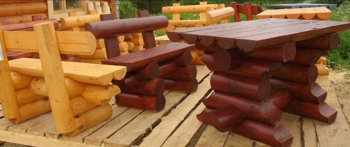 Не менее актуальна бревенчатая мебель для садового домика, беседки на дачном участке или парка. Но оставлять ее длительное время под открытым небом не стоит, так как осадки скажутся на качестве поверхности негативным образом.