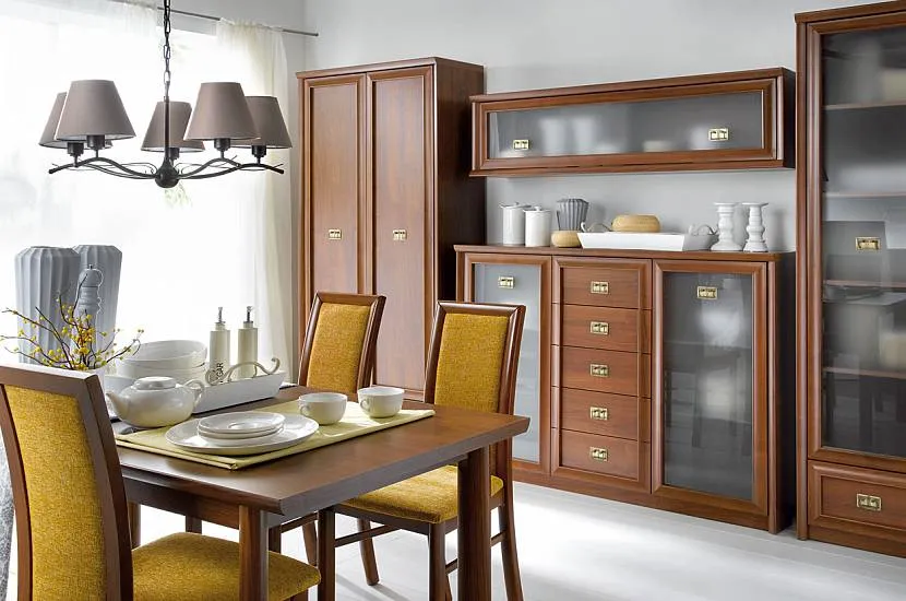 При изготовлении классической мебели нередко используется золотистый оттенок рустикаль. Благодаря уникальной технологии обработки древесины (включает искусственное состаривание) удается добиться желаемого результата.
