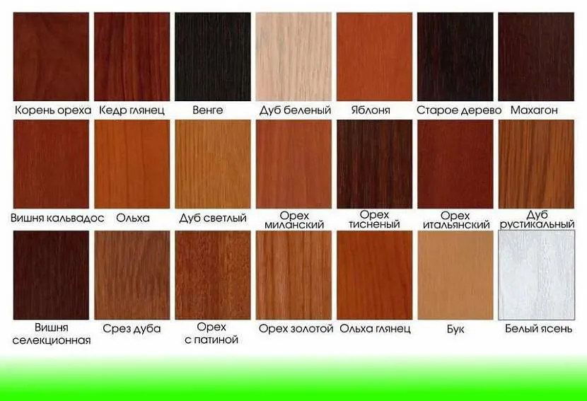 Красное дерево. Среди разнообразных названий цветов мебели это чаще всего ассоциируется с роскошью. Под название попадает несколько пород, включая сандал, махагони (тропические породы), ягодный тис, падук. Древесина имеет красно-коричневый или темно-вишневый цвет; текстура и степень насыщенности у разных сортов отличается. Натуральная древесина со временем темнеет.