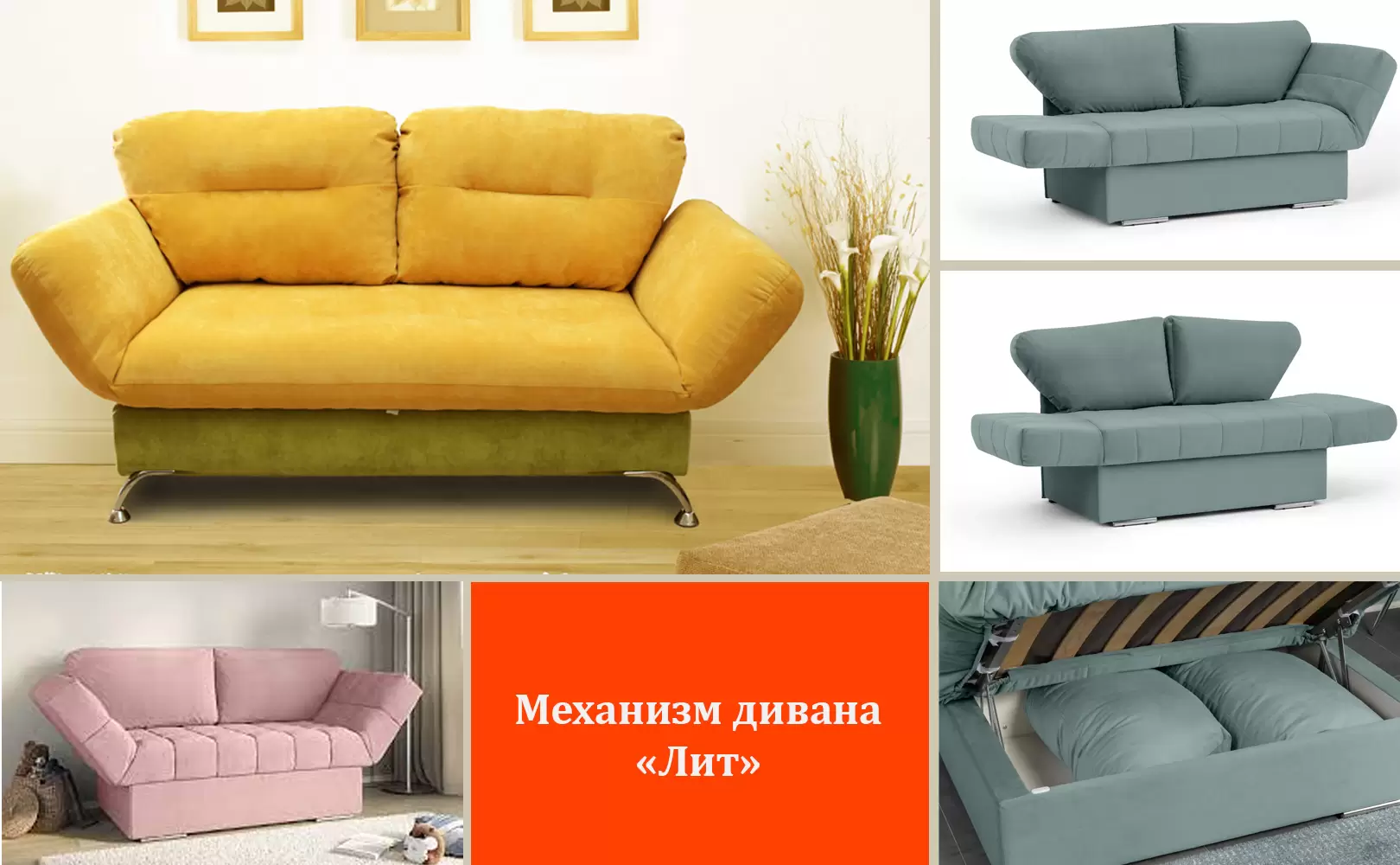 «Лит» методом раскладывания подлокотников напоминает диван «Эльф». Но в отличии от «Эльфа» у «Лита» стационарная не раскладывающаяся спинка. Под сидением дивана «Лит» расположено место для хранения.