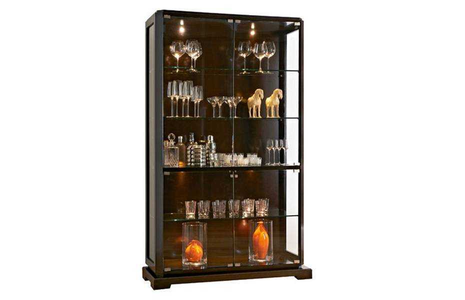 Стеклянные витрины могут хранить любые элементы декора и при этом иметь различное оформление. Правда хранить на стеклянных полках можно только очень легкие вещи, которые не способны нарушить целостности перекрытий. Можно выгодно подчеркнуть отдельные элементы при помощи бликов разноуровневой подсветки, которая будет окрашивать фарфор и стекло в разные цвета. Если необходимо разместить в такой витрине со стеклом тяжелые книги, то полочки рекомендуется сделать деревянными, в то время как дверцы могут быть изготовленными из стекла. Визуально увеличить шкаф помогут зеркала, которые устанавливаются вместо стенок.