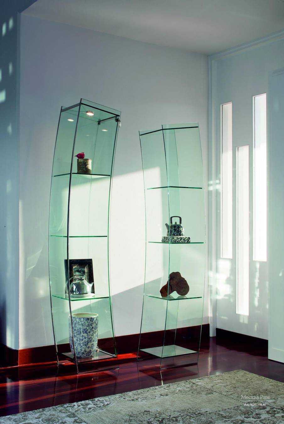 - стенки не делаются закрытого типа, что позволяет рассматривать содержимое стеклянных полочек с разных сторон. Это сделает возможным не только зонировать имеющееся помещение, но и увеличить общую функциональность. Такие навесные стеклянные конструкции не занимают много места, зато могут украсить любое помещение.
