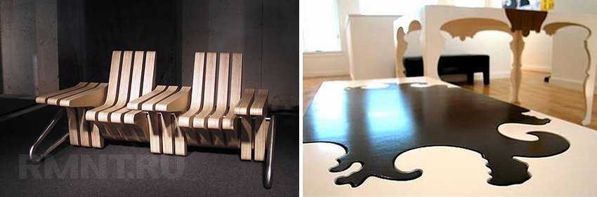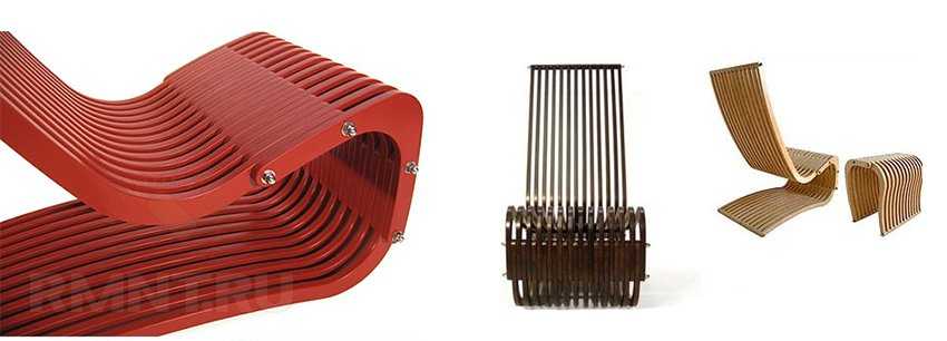 Простота изготовления, утончённость, минимализм и своеобразная ажурность образцов мебели из фанеры за счёт использования множества скреплённых между собой резных деталей — ламелей, позволяют совершенно по-иному взглянуть на, казалось бы, тривиальный мебельный материал.