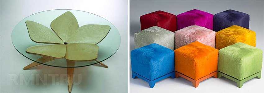 Слева: цветочные мебельные мотивы Шиге Хасегава (Shige Hasegawa), Япония. Справа: «солнечные» фанерные пуфики, оббитые крашеным мехом, от Kyle Bunting Furniture & Art