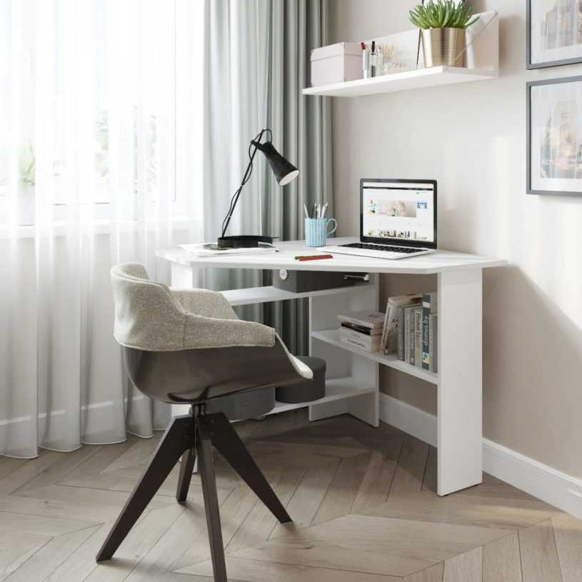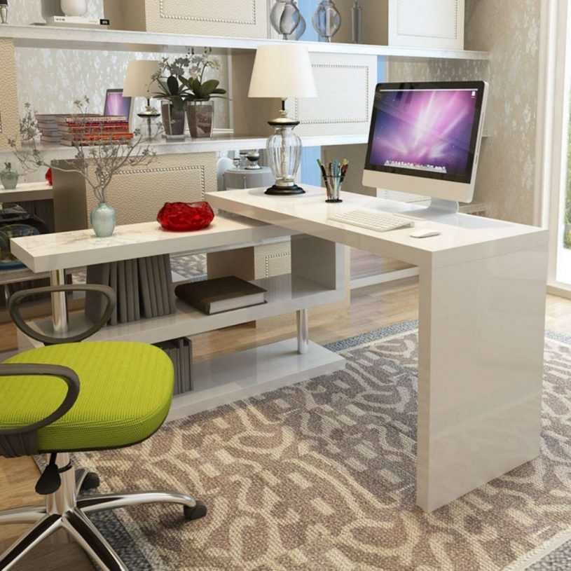 Очень эффектно смотрятся столы с дополнительной полкой, акцентированной цветом, фактурой или фотопечатью. Недавно в продаже появились необычные письменные столы и тумбы, которые, раскладываясь, образуют гарнитур, в который, кроме самого стола, входят еще два стула.