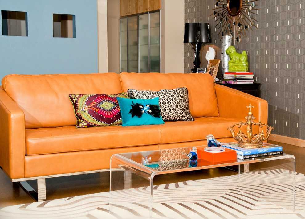 Обратите внимание на интересный интерьер комнат с применением оранжевого дивана. Ярко и стильно смотрится яркий диван с современными подушками на фоне акцентной стены в тон