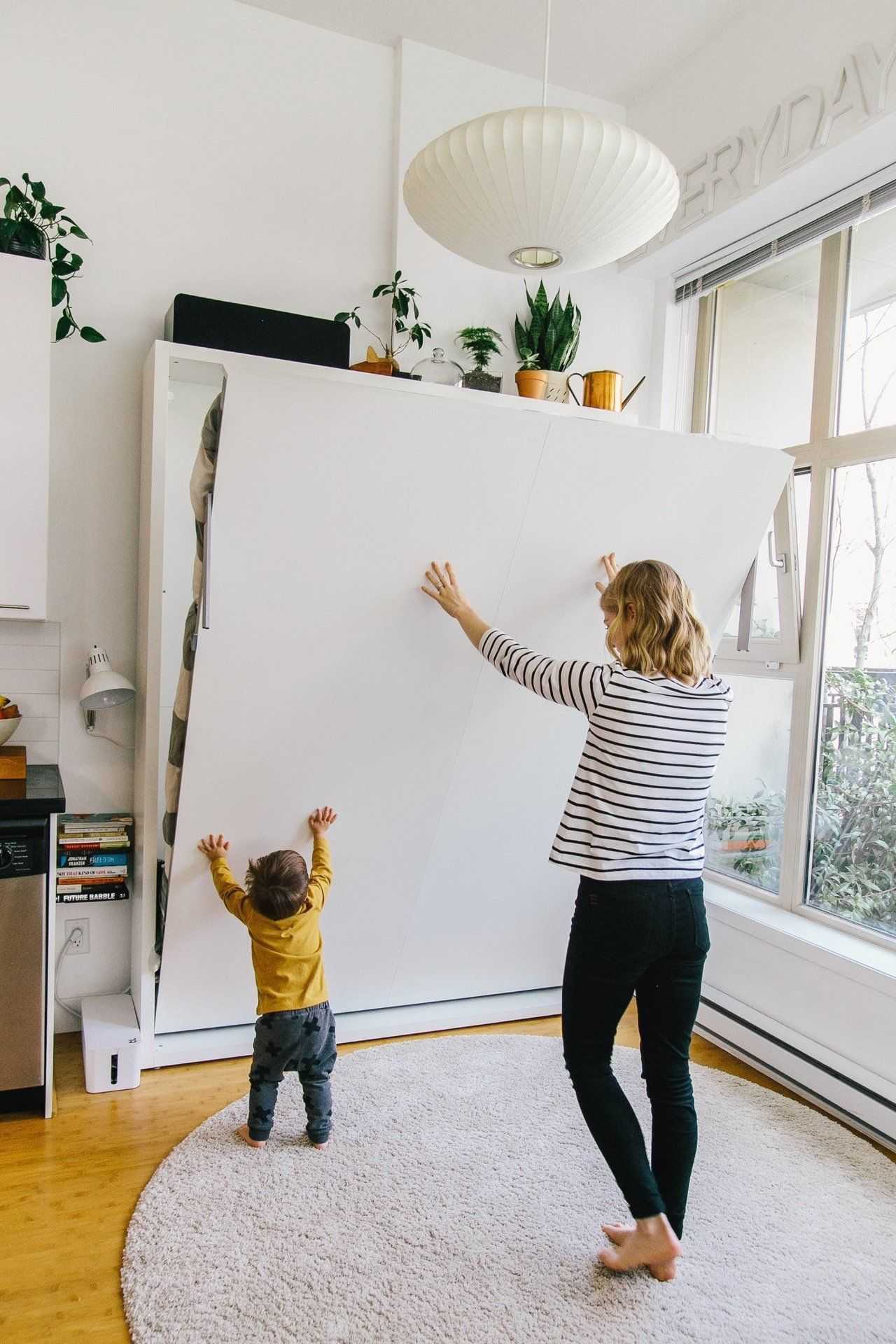 кровать в вертикальном положении и спрятать её внутри шкафа. Но