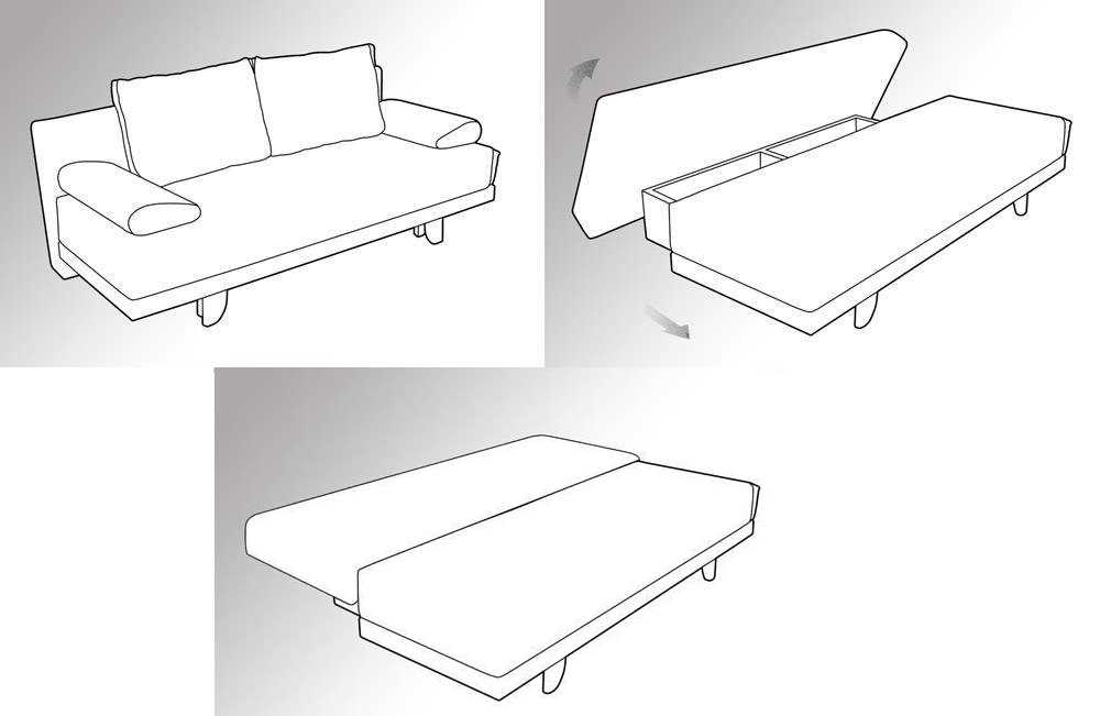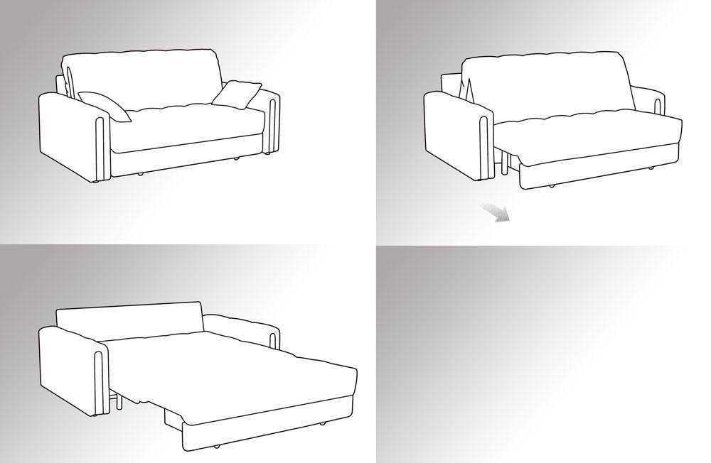 - Книжка — сиденье приподнимается до появления характерного щелчка и затем опускается, превращаясь в двуспальную кровать.