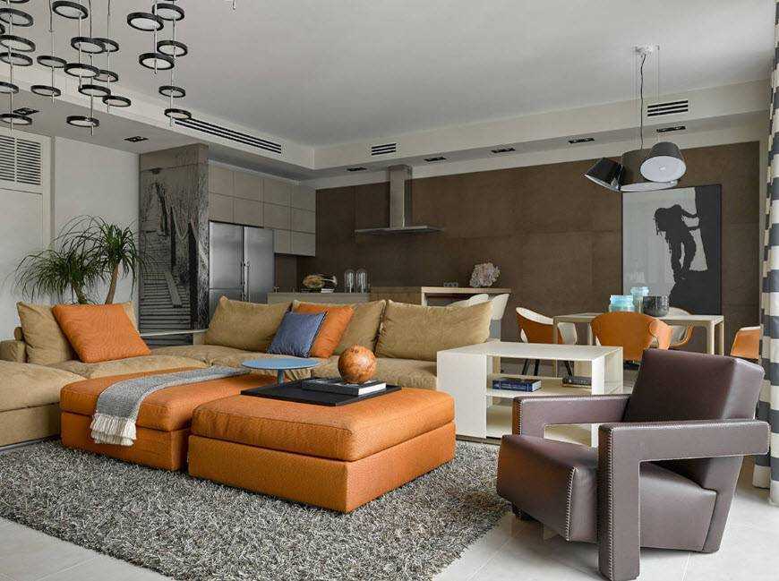 Также гостиную можно совместить с кухней, что позволит сделать ее более просторной, а вот в небольших гостиных придется потрудиться, ведь нужно использовать различные дизайнерские приемы, помогающие визуально увеличить пространство