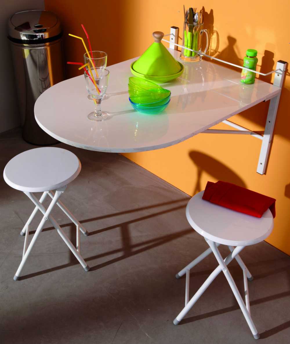 Вызывают большой интерес виды столиков с плоской опорой, выполненной в виде треугольника и прикрепленной к стене под столешницей. Не менее удачными считаются модели на кронштейнах, установленных без петель и созданных из металла или нержавеющей стали.