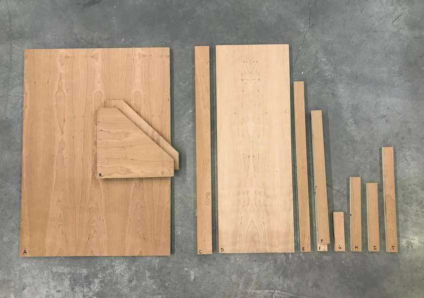 Сначала надо все измерить, как показано на схеме слева, затем выпилить детали, как показано на картинке справа. Размеры указаны в дюймах, переведите их сантиметры, умножив на 2,54.
