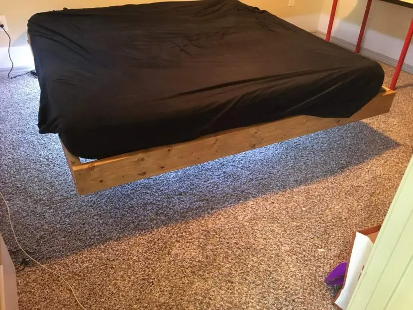 - Собирают прямоугольное или квадратное основание. Прямоугольный вариант для парящей кровати предпочтителен, так как он уже, и будет менее бросаться в глаза. Внутри устраивают место хранения, снаружи усиливают (например, металлическими углами).