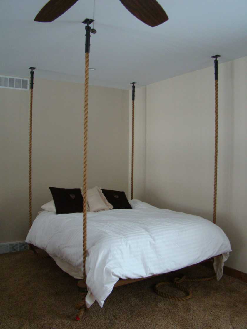 - Фиксированное положение. Вы не сможете сделать перестановку в спальне. Если вы захотите заменить висячую кровать традиционной моделью, понадобится экспресс-ремонт в месте крепления.