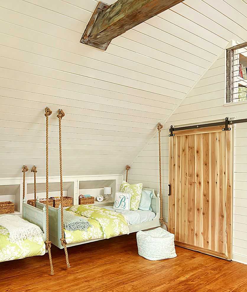 Для многодетных семей будет интересен вариант двухъярусных подвесных кроватей. Как и обычные двухэтажные кровати, они располагаются друг под другом. Только в отличие он первых, подвесные кровати не касаются пола. В целях безопасности и спокойствия родителей такие кровати крепятся одной стороной к стене. Но, в общем, идея подвесной кровати сохраняется за счет крепления на канатах другой стороны основания спального места.