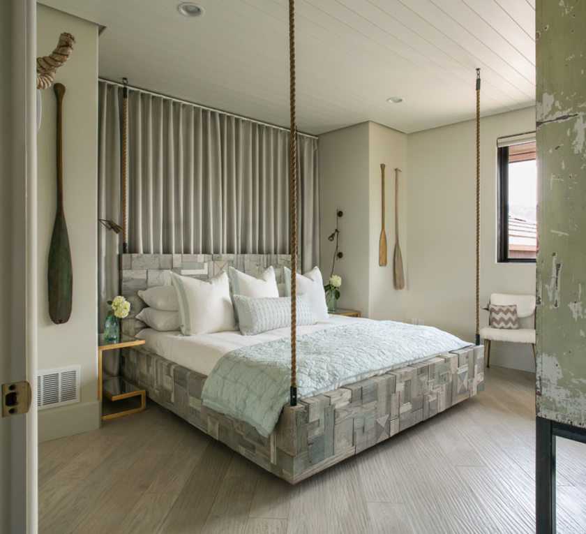 В хай-теке стропы подвесной кровати уместно закрепить на трубах, проложенных по потолку. Если вы захотите устранить эффект раскачивания, но оставить кровать в подвесном состоянии, закрепите изголовье на стене и оставьте канаты только в ногах. Такой комбинированный способ решает дилемму между устойчивостью и оригинальностью.