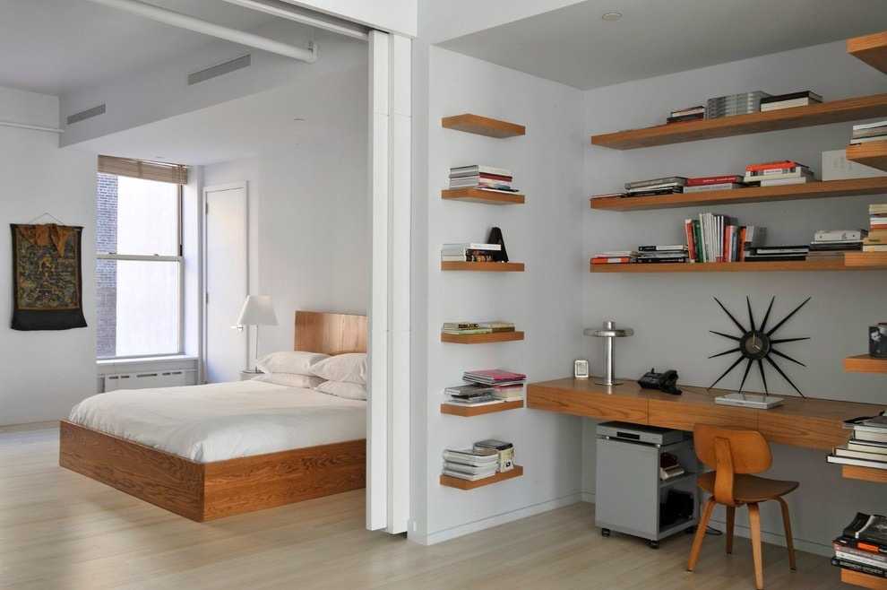 - Если площадь вашей комнаты позволяет вам использовать больше места, то здесь отлично подойдут стеллажи.