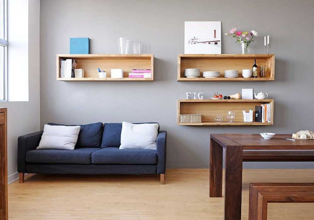 Тонкие полки, на которых размещены сувениры или книги – это отличный выбор для маленьких комнат, а вот полки нестандартной формы лучше размещать в просторных помещениях – там они будут смотреться выигрышно.