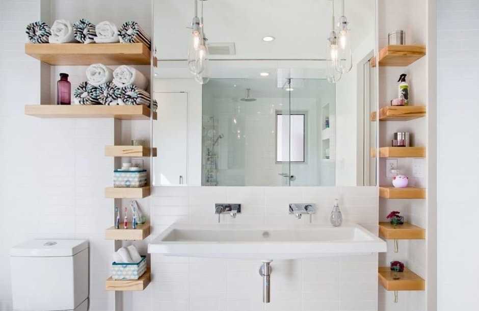 Полка у умывальника или перед зеркалом пригодится для хранения всевозможных принадлежностей, которые неудобно постоянно убирать в шкаф мокрыми.