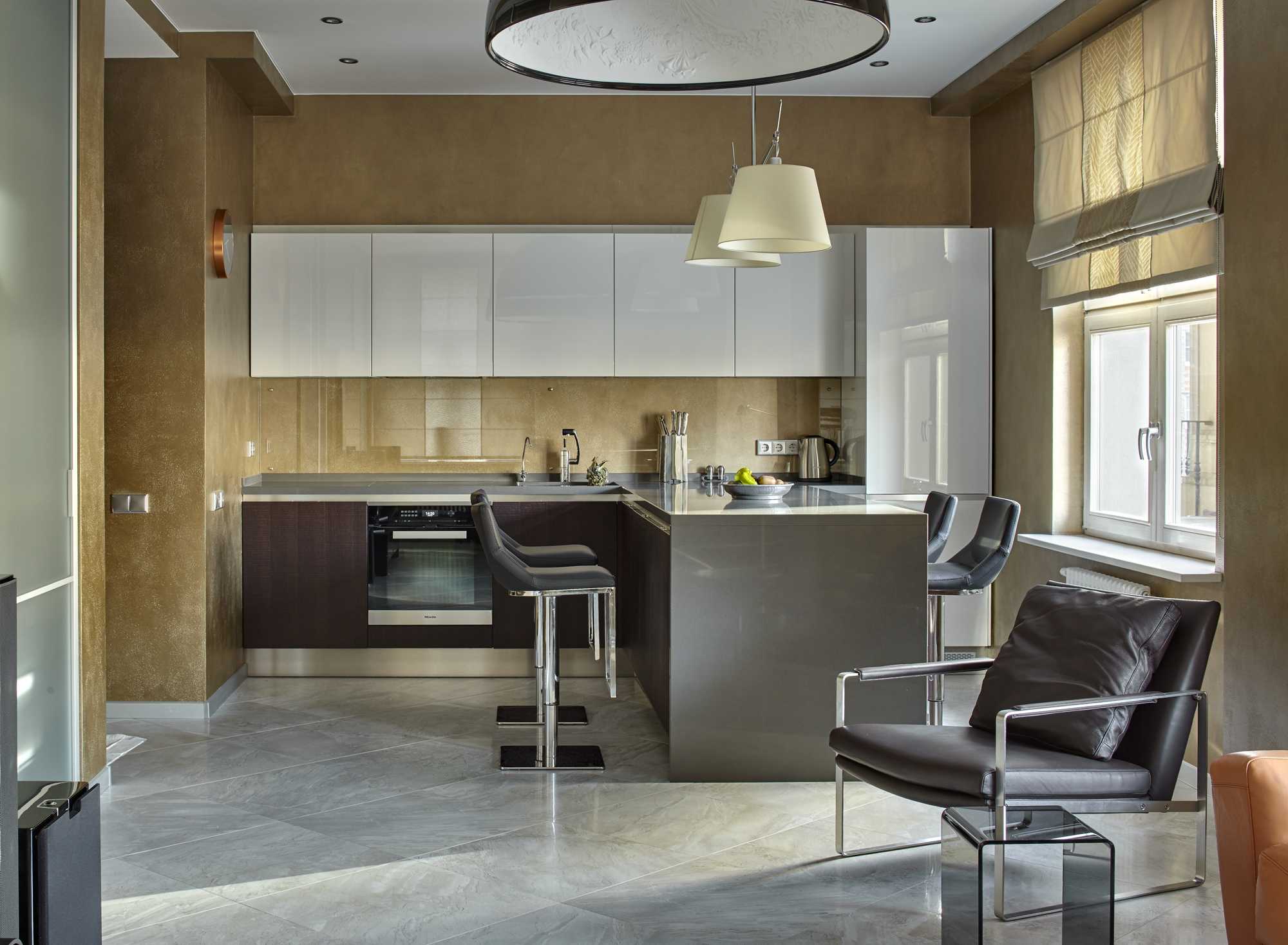 Кухня в студиях, как правило, совмещена с гостиной, что заставляет задуматься о ее внешнем виде особенно тщательно. Поскольку она «участвует» в интерьере гостиной, то желательно все бытовые подробности скрыть (встроенная бытовая техника, мойка и плита по возможности в углах, чтобы с дивана не было видно). Фасады кухни хорошо сочетать с другими предметами мебели в гостиной, а, может, они даже будут из одной коллекции, что создаст цельное впечатление