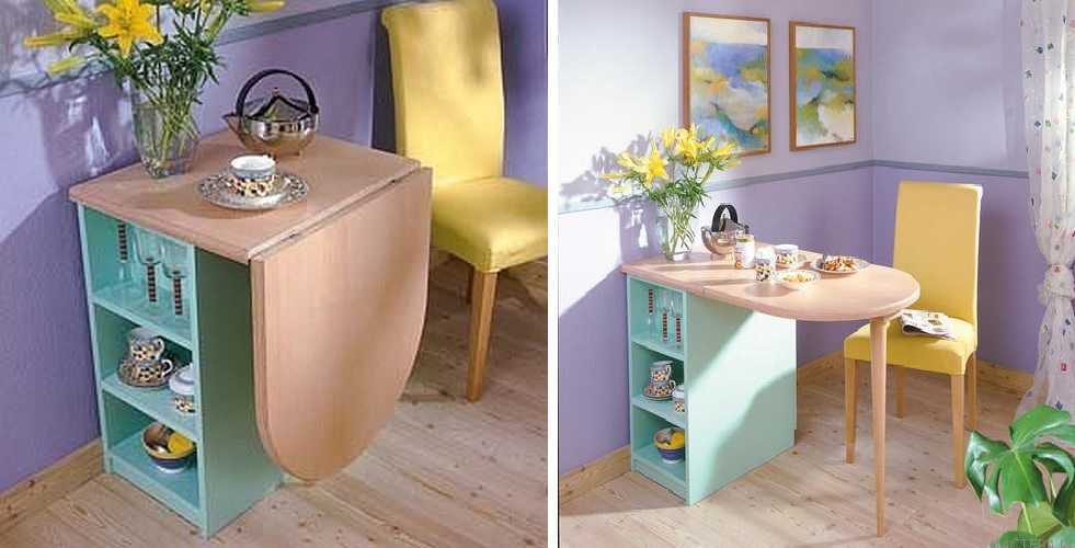 Еще вариации на эту тему: раскладной стол для маленькой кухни прикрепленный к этажерке. В таком варианте даже место под стационарной частью столешницы не «гуляет», а служит для хранения утвари или продуктов.