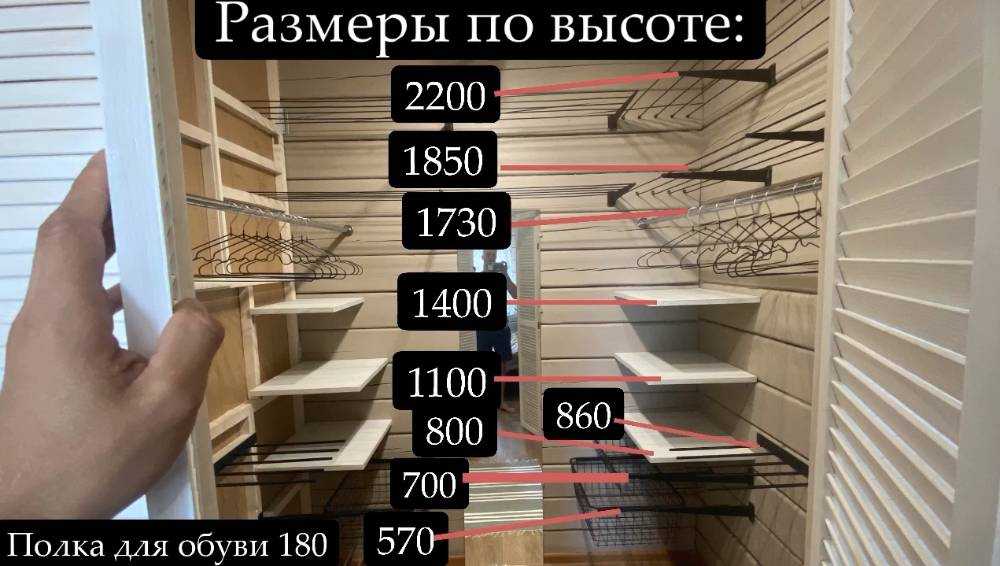 Расчет размера полок для рубашекПример размещения полок в гардеробнойРазмеры полок