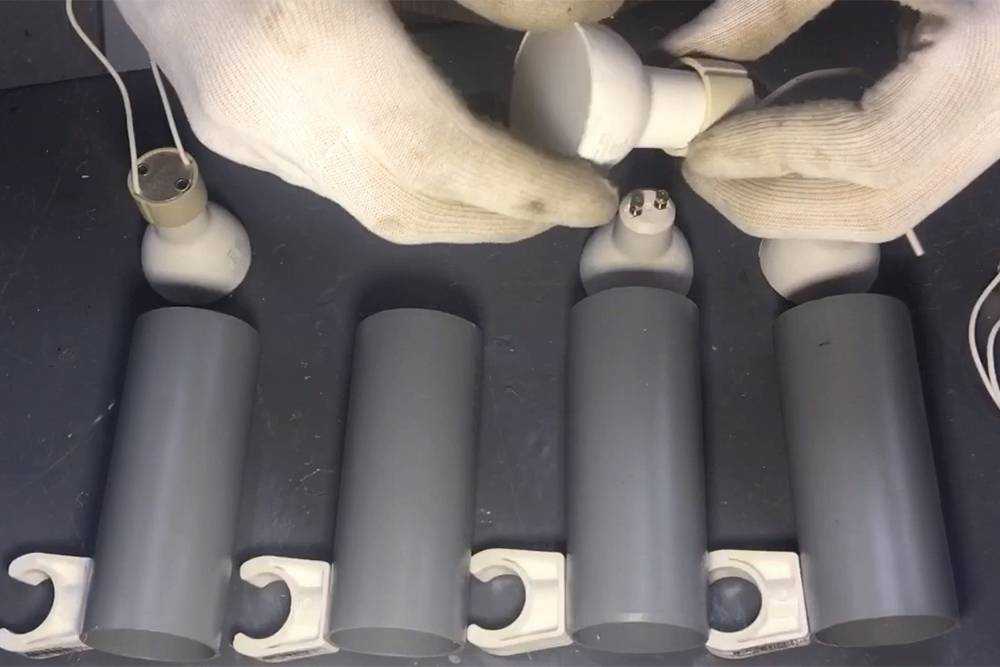 В качестве освещения сделал имитацию трековых светильников, использовал для этого канализационную трубу диаметром 50 мм, полипропиленовую трубу 25 мм, пластиковый крепеж для нее, монтажный провод, светодиодные лампы 220 В, цоколи для них и баллончик краски.