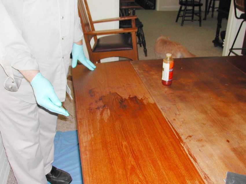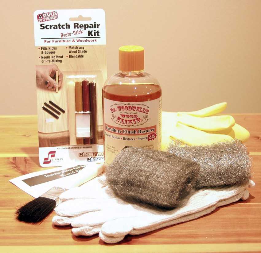 С помощью специализированных составов и средств (шпаклевки, мебельного воска, затирки) нужно замаскировать все дефекты – трещины, перепады или неровности, царапины и сколы. Выбор материала зависит от объема повреждений. Так, глубокие трещины лучше заливать воском, большие потертые площади – зашпаклевать, царапины и сколы – затереть.