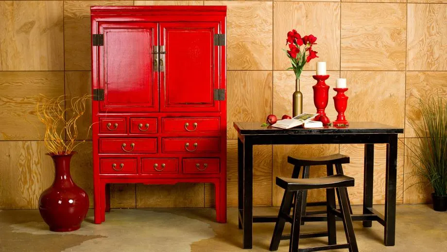 Интересно смотрится искусственно состаренная мебель из дерева. Чтобы добиться эффекта под старину, поверхности окрашивают тёмной и светлой краской, чтобы первый слой просвечивал сквозь финишное покрытие. В качестве альтернативы отдельные элементы обрабатываются шкуркой или затираются тёмным воском.