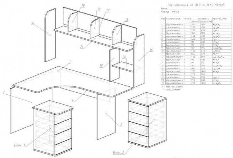 Перед тем, как рисовать чертеж, необходимо определиться с конструкцией компьютерного стола. В классическом исполнении такое изделие состоит из трех модулей: