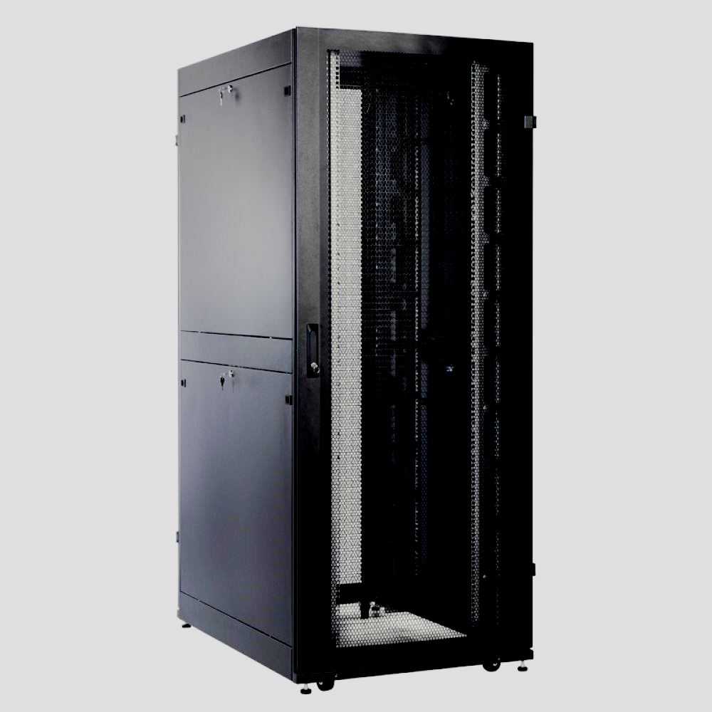 Этот продукт предназначен для размещения пассивного и активного оборудования в серверных. Серия состоит из конструкций напольного типа. Максимальная грузоподъемность – 1361 кг. Корпус окрашен в черный цвет. Размер – 75х199,1х107 см при весе 155,95 кг. Высота изделия составляет 42 юнита. В качестве защиты от коррозии используется специальное напыление. Устройство выглядит массивно, и позволяет разместить технику любого размера. Отличное решение для крупных корпораций.