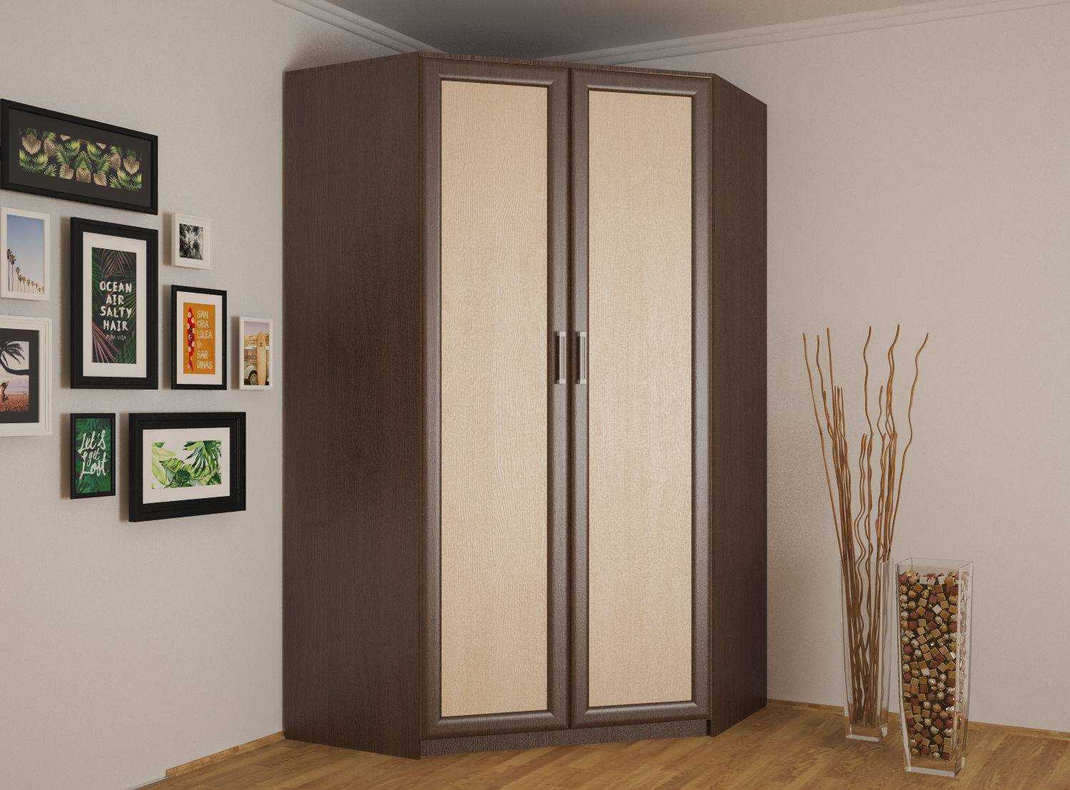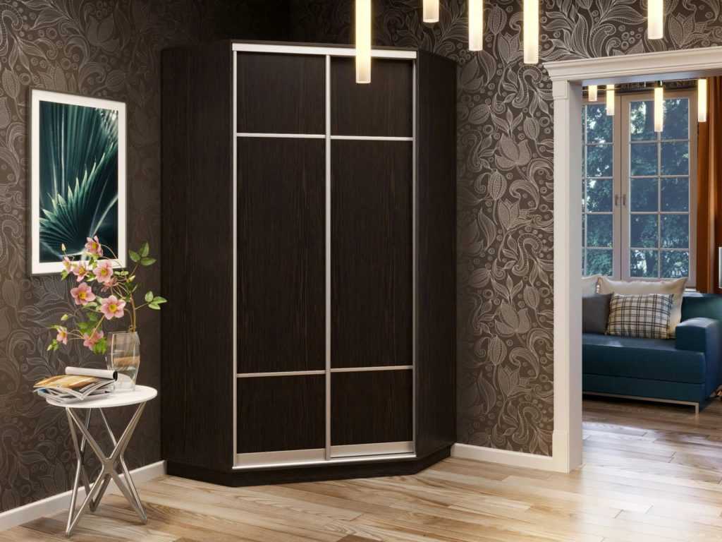 Угловая конструкция и раздвижные двери позволяют не занимать слишком много пространства в комнате. Внутреннее оснащение представляет удобную систему хранения, состоящую из продольной штанги и множества полок. Параметры: 110х45х220. Материал изготовления: ЛДСП. Производитель: МФ Хочу домой. Цена – 30690 руб. за штуку.