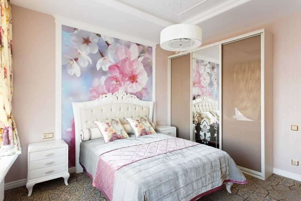 Для спальни рекомендуется выбирать нежные мотивы. Прекрасно подходят цветочные и растительные принты. На радиусном или угловом шкафу можно напечатать одиночное изображение сакуры, одуванчика или пиона. Картинки должны состоять из плавных линий и иметь не слишком большую яркость и контрастность. Тогда шкаф-купе будет иметь более чем гармоничный вид.