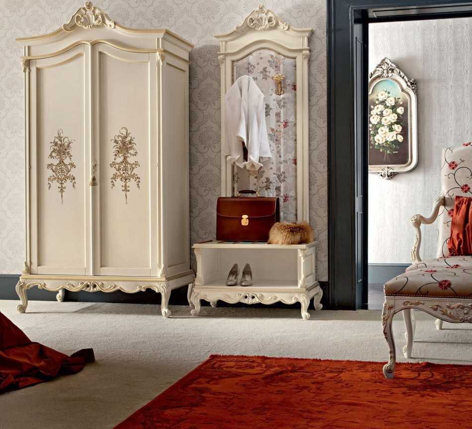 - гардеробные – эргономичные шкафы для одежды, обуви, аксессуаров с широким функционалом. Наполнение здесь разнообразное, разместить можно любую деталь гардероба в специально отведенном для нее месте. Оформить гардеробную классическими деталями можно как снаружи, так и изнутри.