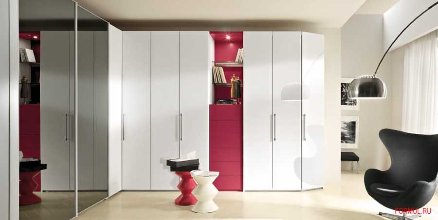 Когда отсутствует возможность монтажа полноценного шкафа в комнату, на выручку приходит угловая модель, которая имеет массу преимуществ. Из-за того, что установка не требует задействования большой площади — можно освободить двойное пространство. Плюс к этому, она служит своего рода маскировкой для сглаживания неровных поверхностей за счет закругленных боковых полок.