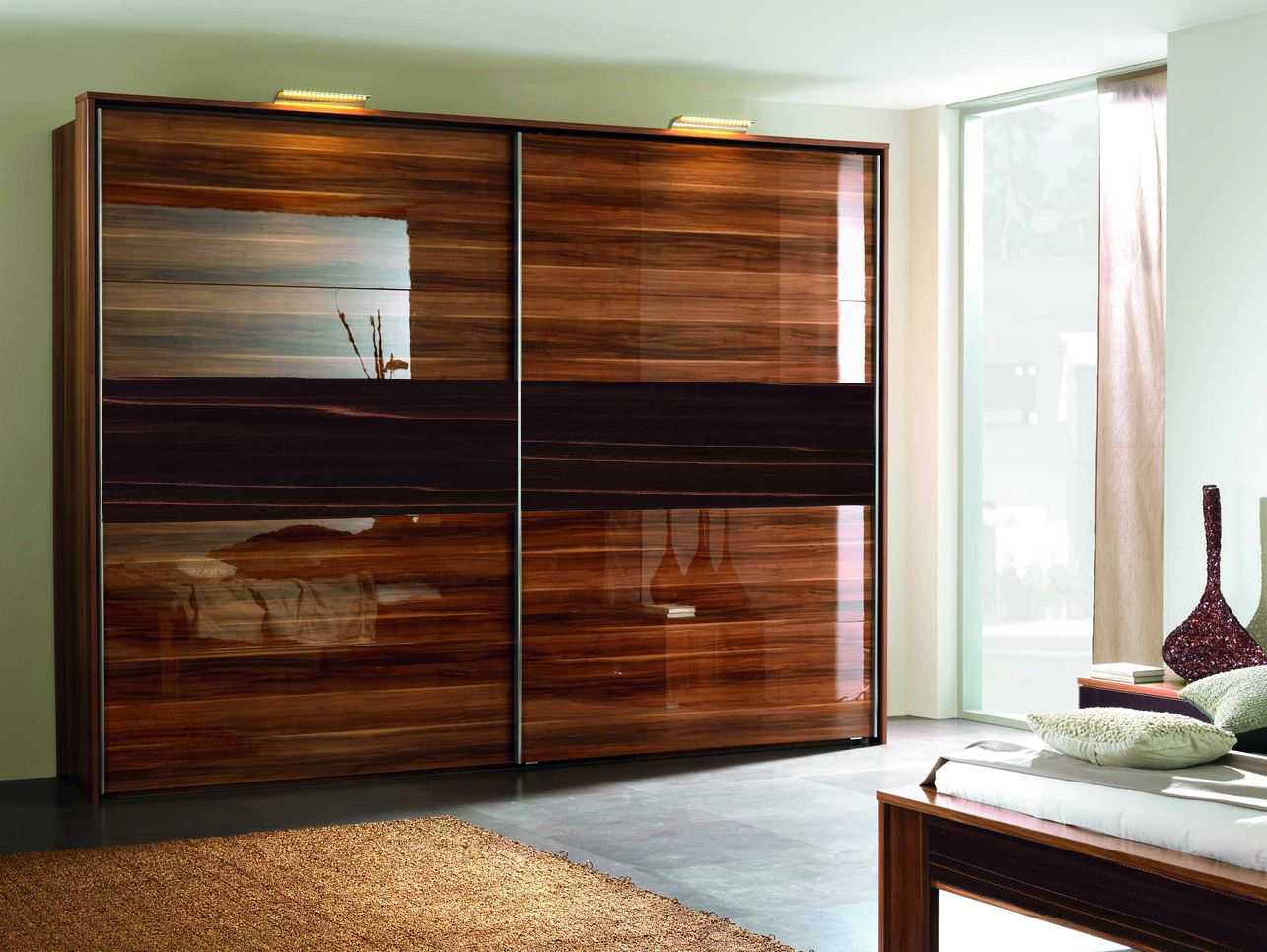 Экстерьер этой мебели во многом зависит от оформления раздвижных дверей. Они декорируются: