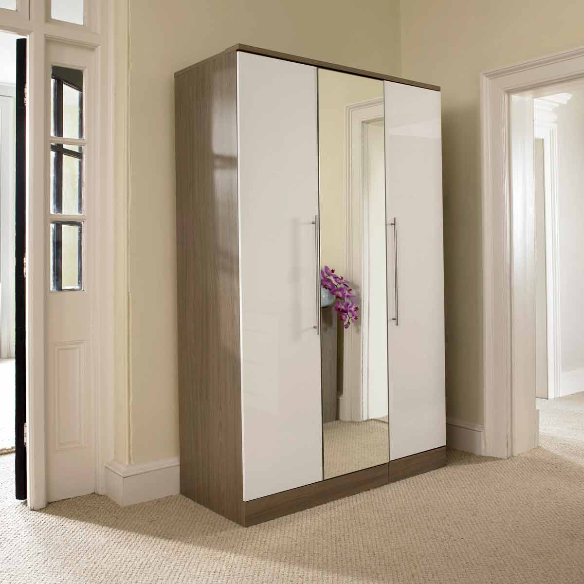 - очень популярным сегодня является шкаф белый глянец, у которого фасад представляет собой декоративную отражающую поверхность. Для его изготовления зеркало с толщиной 4 мм обрабатывается особым составом, надежно защищающим поверхность от рассыпания при ударе. Максимум, что может произойти при сильном ударе об двери, — зеркальный фасад потрескается. По этой причине не стоит думать, что такой декор небезопасен для детской комнаты или спальни. Зеркалом могут украшаться все три дверки, или одна из них. А если комбинировать декоративное стекло со вставками из иных материалов (искусственных или натуральных), можно создавать оригинальные модели для городских квартир и загородных домов. Со стеклом часто сочетают ротанг, бамбук, кожу и текстиль;