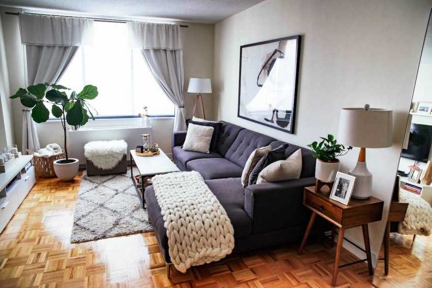 К скандинавскому стилю прекрасно подойдут довольно простые изделия из натуральных материалов. В качестве наполнения выбирают небольшое количество декора, в виде фотографий или картин, чтобы гостиная не смотрелась загроможденной.