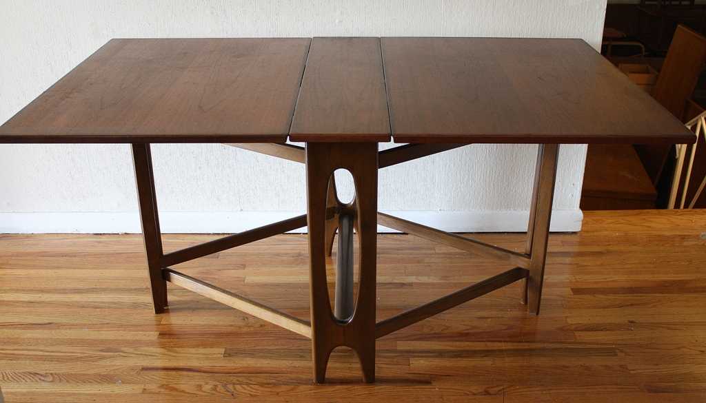 Достаточно раскрыть полотно, чтобы увеличить площадь столешницы, и можно пользоваться. По размерам старые модели имели ширину 85 см, длину от 170 см (разложенный вид). Собранный вариант характеризовался минимальными параметрами – 30 х 85 см. Соответственно, длина разложенного наполовину стола составляла около 100 см.