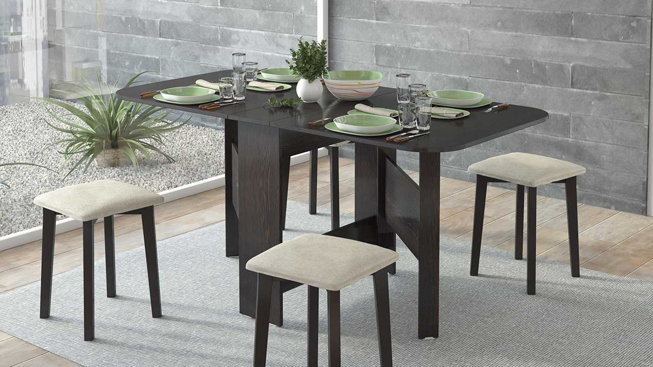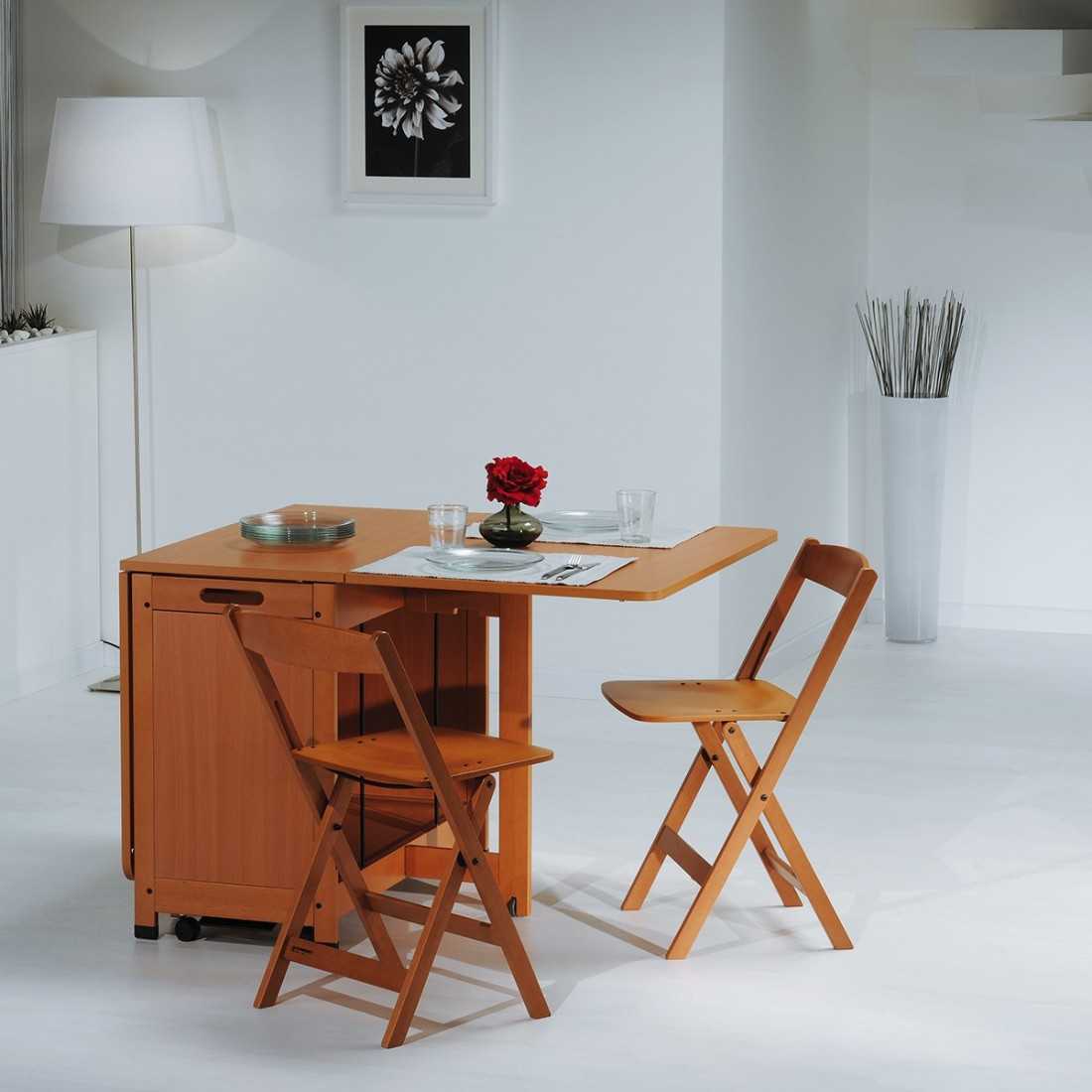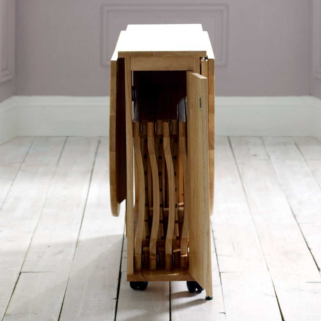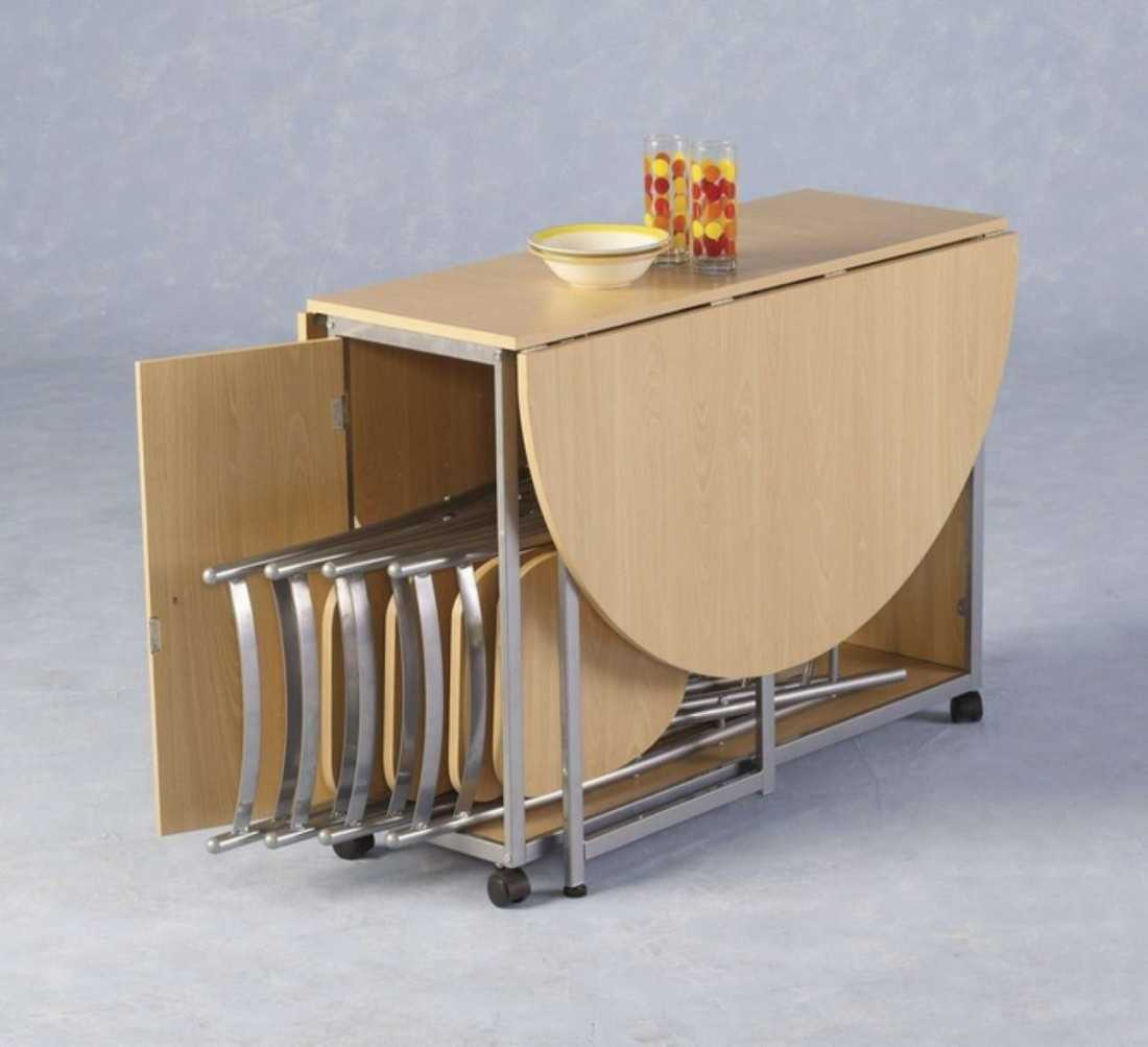 | Модель со складными стульями | Особенностью такой конструкции, является набор стульев, спрятанных внутри сложенного стола. Такие комплекты мебели очень удобны, но и стоимость их будет выше. |