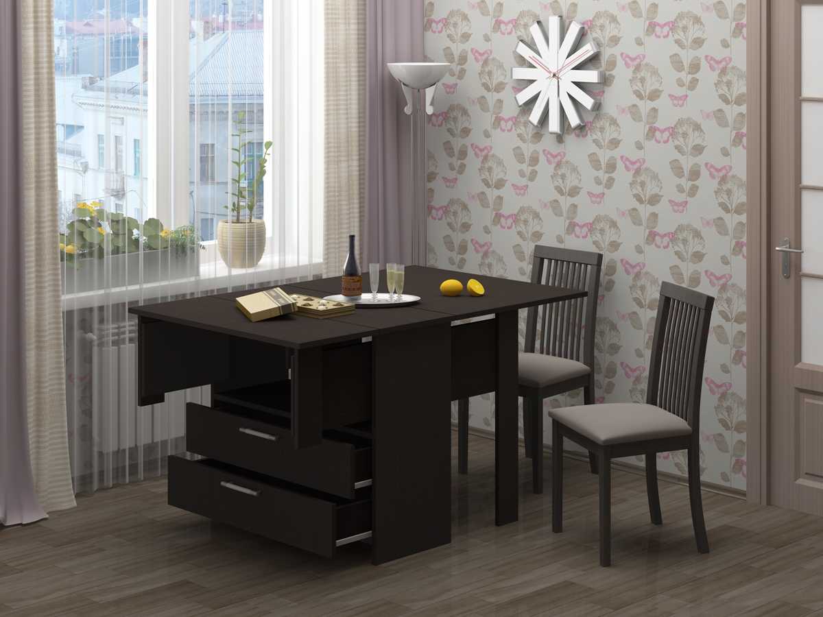 - Стол-трансформер. При желании, стол-книжка может стать столом-трансформером и вмещать в себя дополнительные стулья, мини-бар, и даже ящики для посуды.