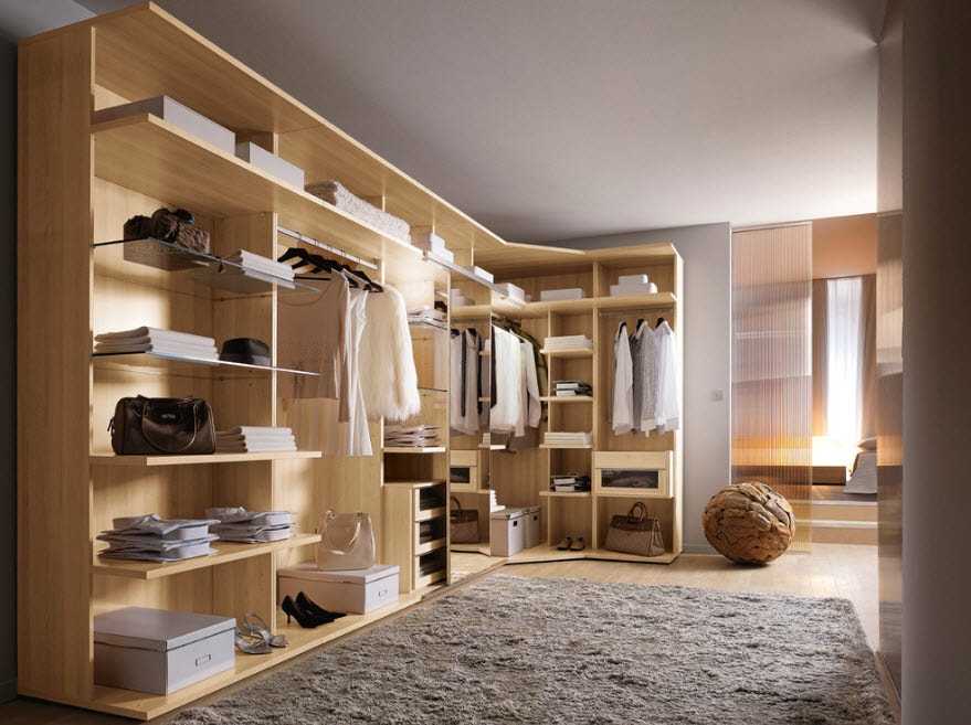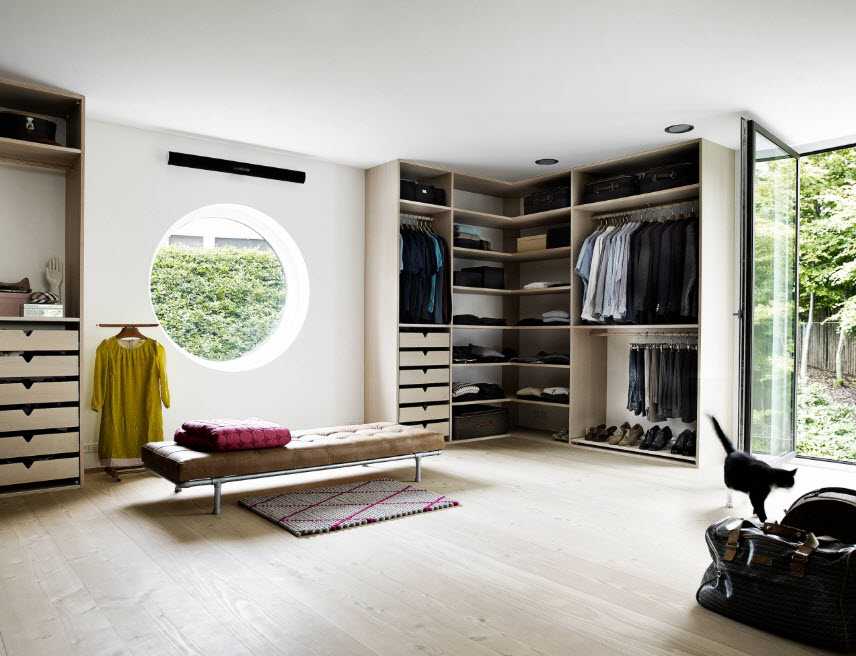 В эту комнату можно установить большой гардероб. Но это отличное решение только в случае, если спальня имеет большую площадь. В нём можно разместить любую одежду, бельё, а также постельные принадлежности. Это очень удобная и функциональная вещь с разнообразным наполнением.