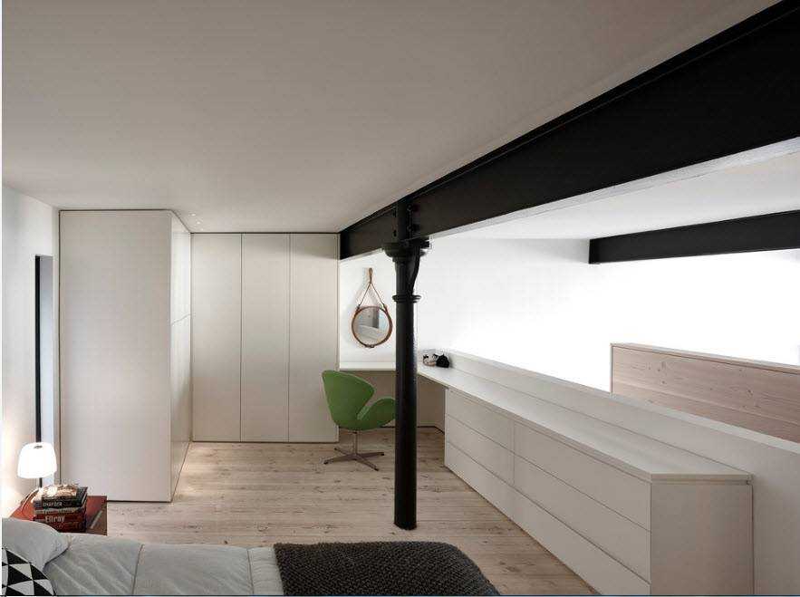 Одеяла и подушки, световые коробки и другие громоздкие предметы упаковываются на мезонине. Центр используется для полок, на которых хранятся комплекты постельных принадлежностей и вещи, хранящиеся в сложенном виде. Иногда это также касается ящиков или ящиков с отделениями для хранения мелких аксессуаров и нижнего белья