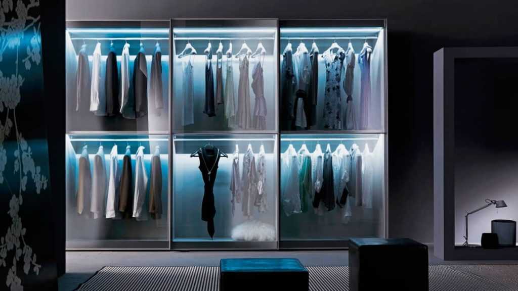 Светодиодная подсветка также может обеспечить достаточную видимость при хорошей мощности, а может применяться в качестве декоративного освещения, особенно RGB ленты, изменяющие цветовую палитру посредством дистанционного пульта. Дюралайт и гибкий неон не лучшие помощники, чтобы рассмотреть содержимое полок, поэтому их стоит использовать как контурную подсветку шкафа. Иногда вместо светодиодных лент используется люминесцентной подсветкой из трубчатых ламп, но это неравноценная замена, так как лампа боится механического воздействия и ее необходимо защищать плафоном.