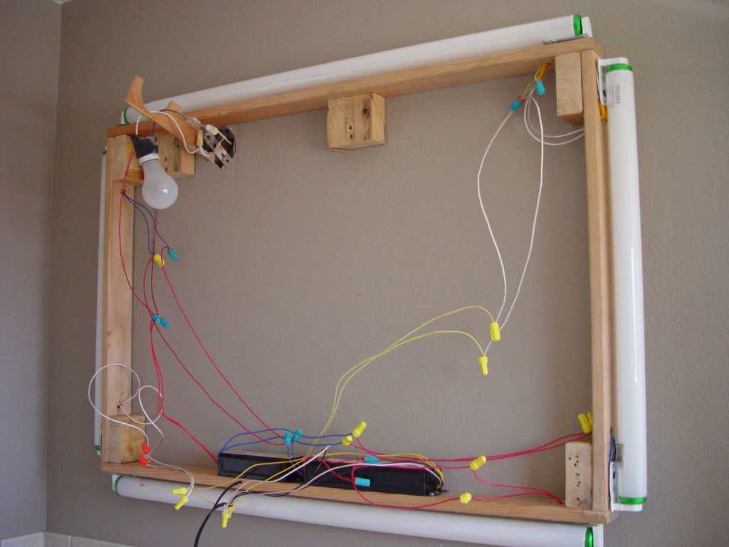 После чего зафиксировать патроны в местах их установки, изолировать кнопку выключателя и зафиксировать проводку непосредственно к раме.