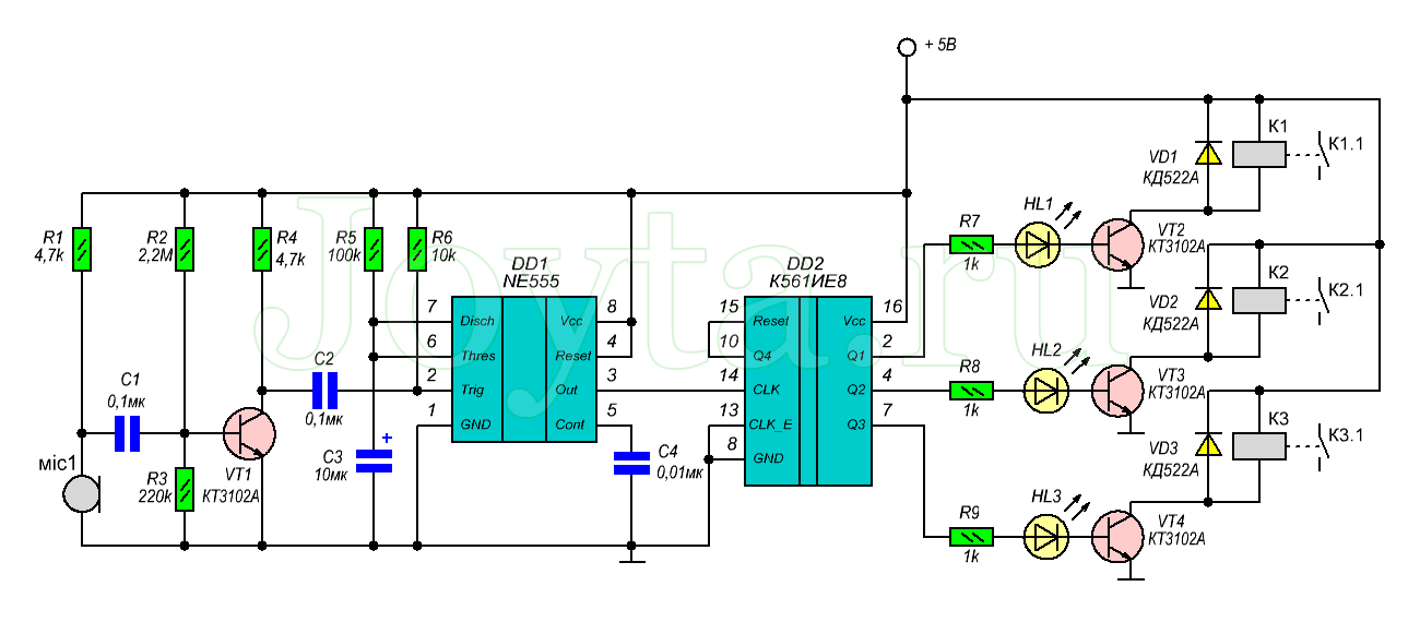 Устройство имеет три канала управления, каждый из которых оснащен индикатором на светодиоде. Основу схемы акустического выключателя составляют две микросхемы: таймер NE555 и десятичный счетчик-делитель К561ИЕ8 (аналог CD4017)