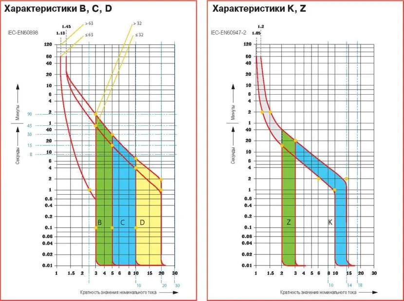 Еще один не менее важный рабочий параметр, отображаемый в маркировке автомата, это время токовая характеристика. Показывает границы величин силы тока цепи, в рамках которых произойдет отключение э/м-расцепителя за определенное временной отрезок.