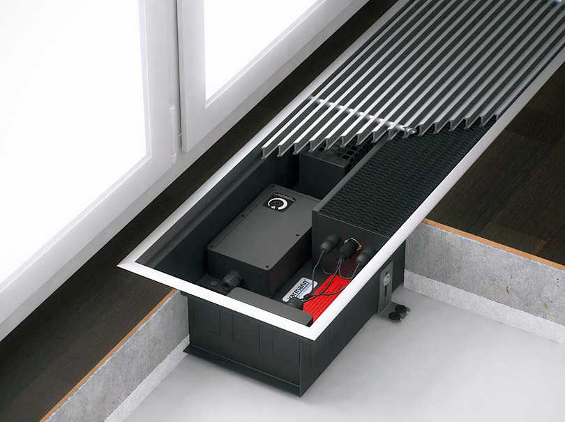 Внутрипольная конструкция дает возможность встроить радиатор в стяжку пола, а затем аккуратно заделать в зависимости от уровня напольного покрытия. Это принципиальное отличие от напольных моделей радиаторов. При этом холодный и нагретый воздух свободно преодолевает радиаторную решетку, тем самым повышая результативность нагрева и по максимуму используя всю площадь устройства.