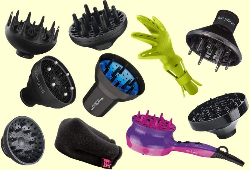 Рассмотрим, что такое диффузор в парикмахерском инструменте. Здесь это сменная насадка с крупным диаметром и узким основанием. Деталь дополнена равномерно распределенными шипами («пальцами») на перфорированном диске. Такое исполнение изначально разрабатывалось для сушки волос после химической завивки без эффекта их спутывания. Принцип срабатывания заключается в фиксации локонов и обеспечении бережного воздействия рассеянного воздушного потока.