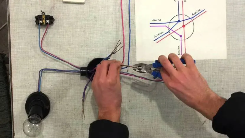 - Провести монтажные работы по установке источника освещения и выключателя, затем осуществить действия по их подключению.